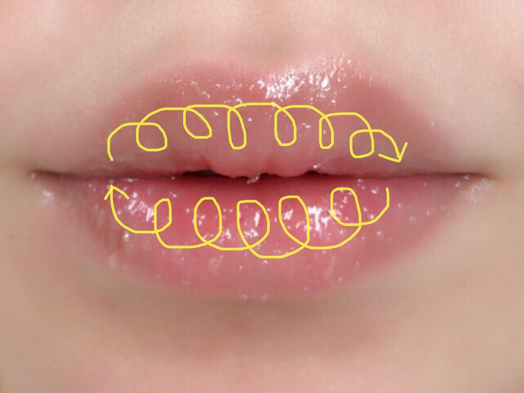 請如圖片所示,用畫圈的方式使用砂糖去角質膏(也不要忘記唇部內側……♡)。搓揉過頭的話反而會讓嘴唇受傷所以要小心! 去完角質後用溫水沖洗,再用護唇膏讓保濕的效果更上一層樓!