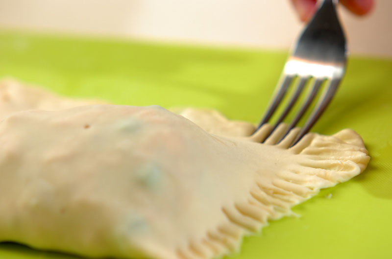 3. 派皮的半面擺上(2)、派皮的邊緣塗上薄薄的<蛋黃水>、包起(2)的派皮折成兩個、重疊的派皮邊用叉子壓。剩下的也同樣做法。