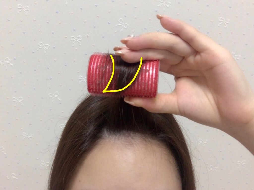 (1)將瀏海直直往上拉,將髮根包住髮捲