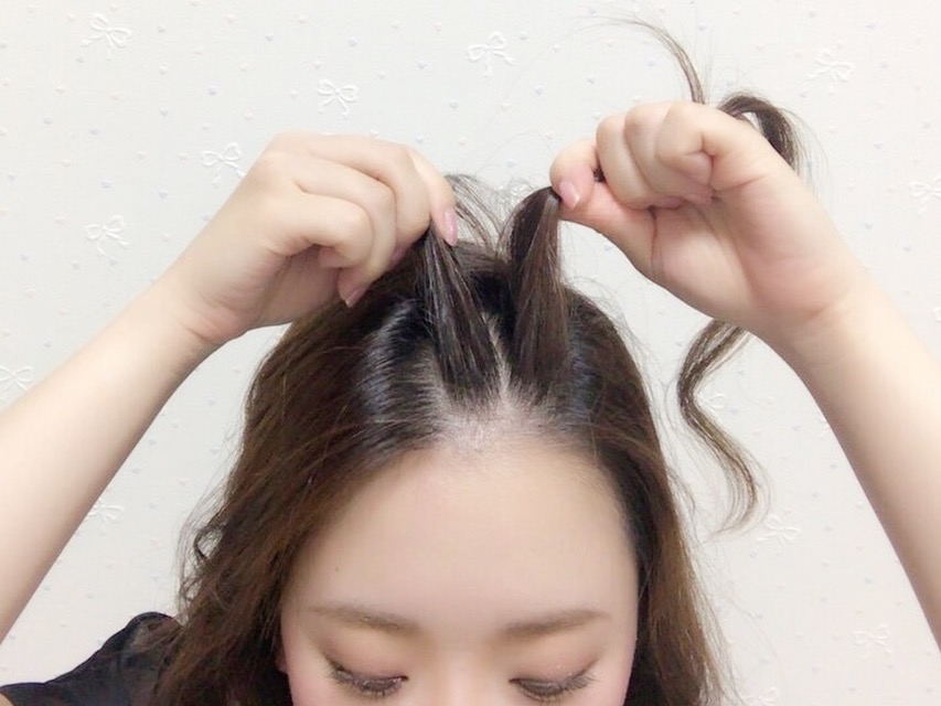 把想要的瀏海分成兩束。如果兩束抓得太扎實,使用技巧時會容易變得好像折過的形狀,所以以細長的髮束來分。