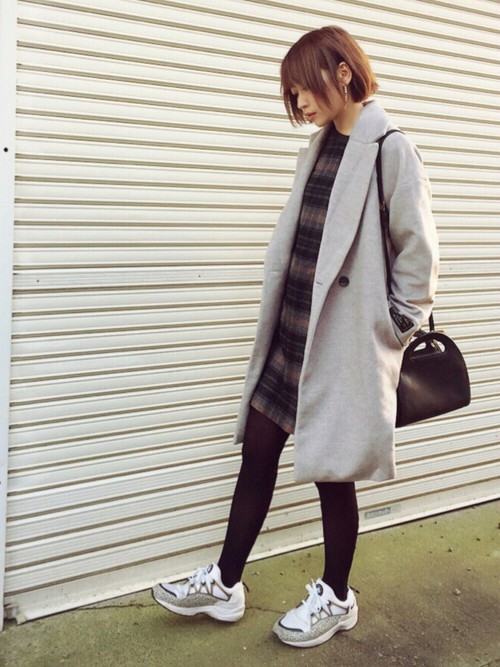 簡單的灰色針織洋裝披上黒色雙排釦外套很能營造出時尚感。配色上都統一的話整體視覺效果會很漂亮唷!