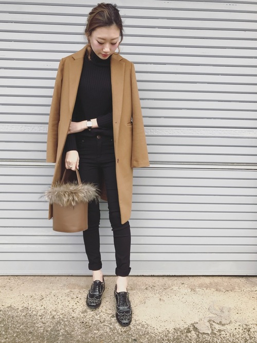 用黑色統一的單色穿搭可以配上駝色雙排釦外套提升明亮度。黑色×棕色等深色配色很適合接下來的季節