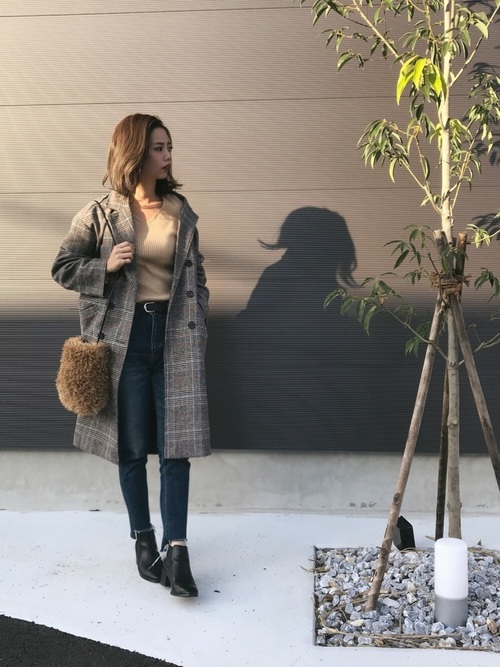 千鳥格紋的雙排釦外套非常時髦◎大人感十足所以即使是休閒風也馬上會有成熟感。用毛皮小物增加柔軟感也很good!