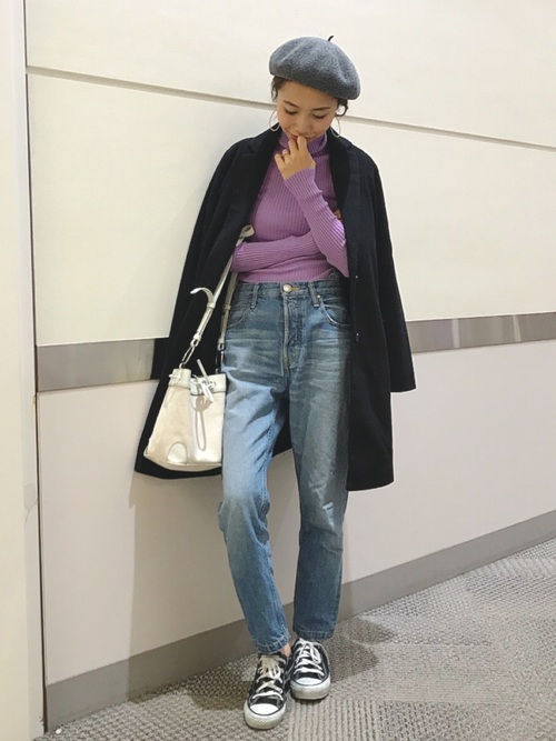 淡藍色的丹寧褲還有明亮的紫色針織搭配的休閒穿搭用黒色雙排釦外套一口氣修飾可以營造出成熟大人感。穿上雙排釦外套可以讓休閒風穿搭也變得很有型喔!