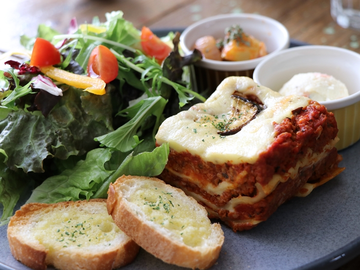Glocal Cafe 的營業時間是11:00~23:00(L.O22:00),11:00~14:00是午餐時段。午餐品項的價格帶落在950日圓~1,166日圓(不含稅)之間,有主菜料理並附上法式湯品、沙拉、可自選的2種配菜、飲品(1杯)。其中特別受歡迎的,是紐西蘭風千層麵與肉派。Glocal Cafe 的老闆娘是紐西蘭人,這些料理據說是按照這位老闆娘的家傳食譜所製作的。