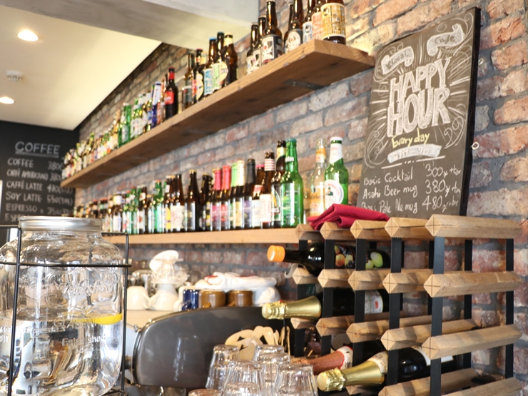 吧檯的長腳椅,也散發出一股令人覺得該不會是用小學的椅子改裝的吧?的不可思議氣氛。在吧檯裡的櫃子上,陳列著和「能夠和世界各地旅人相遇的咖啡吧」很相襯的世界各國啤酒,在店內的書架上則有旅遊導覽雜誌大量一字排開。