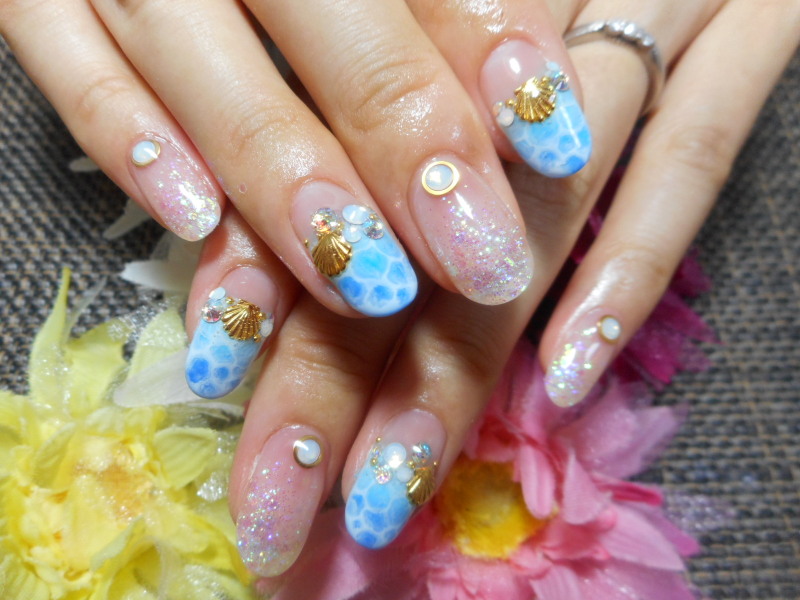 使用藍色為主的水紋藝術美甲。如同水面般的清爽,相當適合夏天。