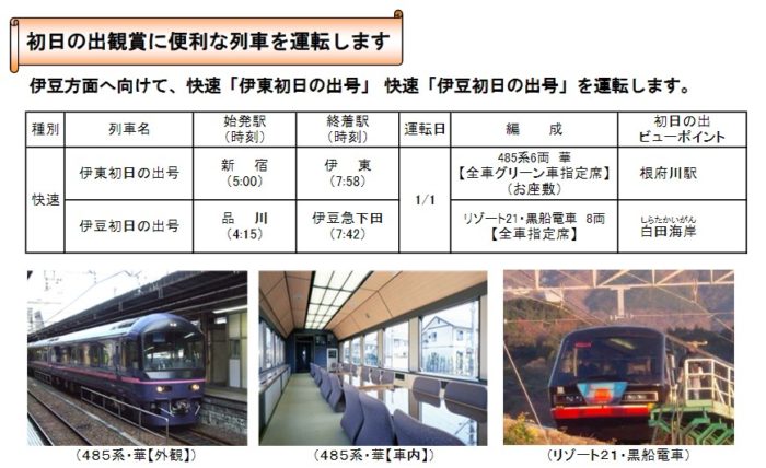 在日本,元旦這一天觀賞日出其實也是一項蠻熱門的活動,除了有許多介紹最佳日出觀賞景點的文章外,從東京出發也有許多班專門讓你趕赴觀賞日出的「日出列車」。每年約在11月左右,東日本旅客鐵道株式會社也會公布新一年的日出列車資訊。2018年甚至還做了一個特設網站,讓大家可以一覽所有日出列車資訊。除此之外也可以注意JR東日本日文網站首頁中底下的鐵道相關最新資訊,通常在十月中或十一月中時就會公布跨年相關新幹線或特殊列車的資訊囉!