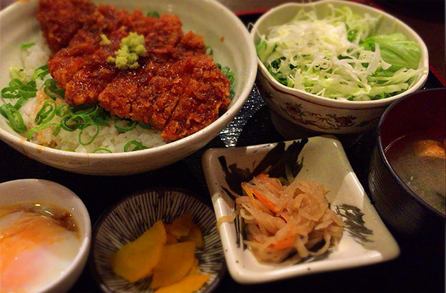 醬油豬排蓋飯(700日元),炸好的豬排淋上日式醬油所調成的香甜醬汁,再依個人喜好拌上山葵,或者拌入半熟蛋,一份定食可以嘗試三種吃法,適合喜歡嘗試新口味的人。