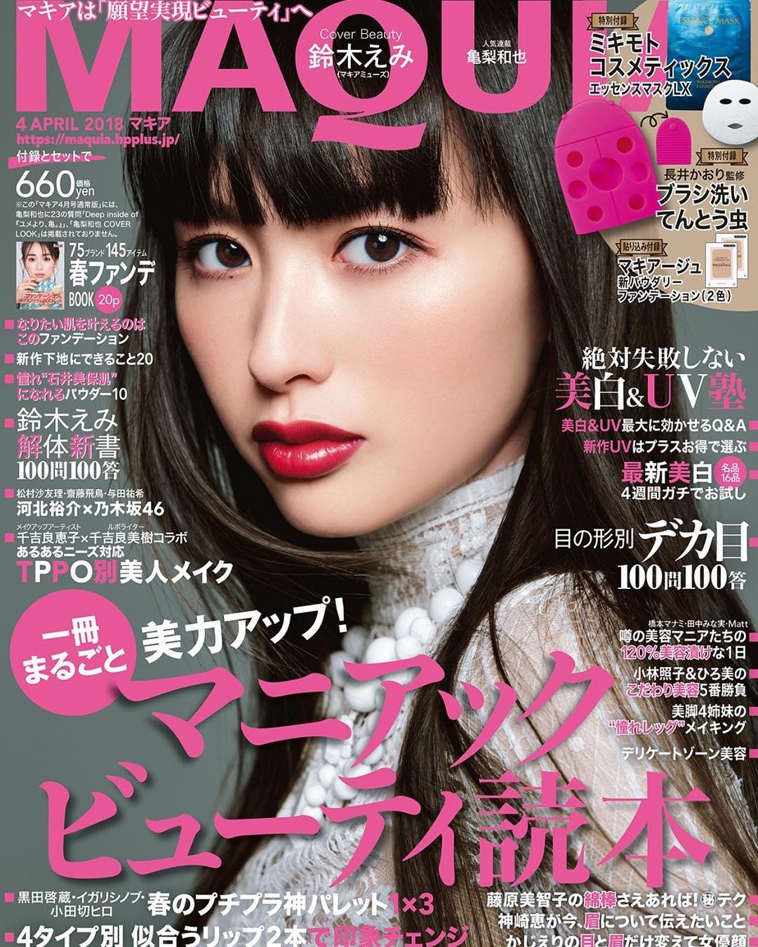 圖片來源贈品:知名髮妝師長井香織監製刷具清潔器&MIKIMOTO COSMETICS ESSENCE MASK LX珍珠精華面膜1片&MAQuillAGE新粉餅兩色試用光是一片價值1,620日圓的珍珠精華面膜就夠超值,還有每個有在化妝的朋友都需要的清潔器,內頁附錄則是粉餅的新品試用,還蠻不錯的哦!リンネル 2018年 4月號