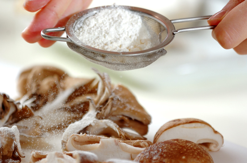1. 菇類跟青紫蘇上灑一些麵粉(份量外)。<麵糊>的蛋跟水輕拌,然後放入麵粉、太白粉攪拌。