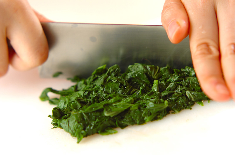 摘除黃麻菜的葉子、清洗後用熱水川燙一下。濾網撈起後倒入冰水裡、降溫後把水分瀝乾切碎。將黃椒、紅椒的種子跟棉絮去除後切成約1cm的塊狀。【作法】