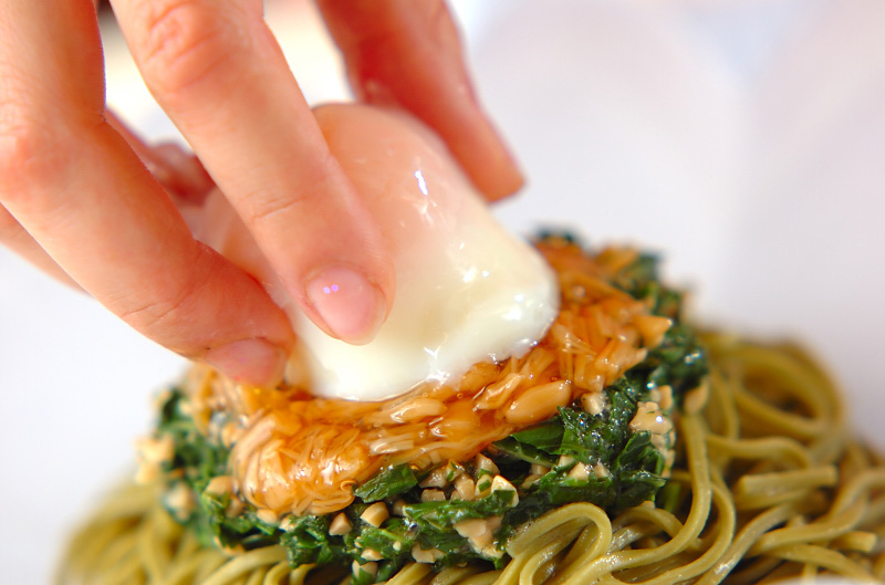 1. 碗裡放入黃麻菜、納豆及附贈的調味料混合後放在綠蕎麥麵上。接著依序放上香菇、溫泉蛋、最後再撒上黃椒跟紅椒就完成囉。