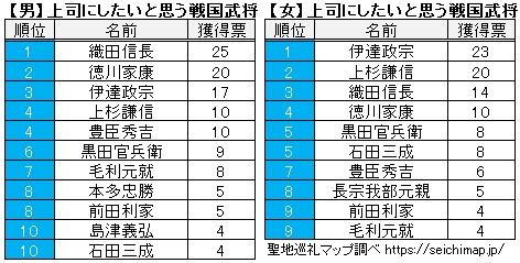 依男女別看「想讓他當您上司的戰國武將」,結果男性選出的第1名是「織田信長」、女性選出的第1名是「伊達政宗」。◎調查概要