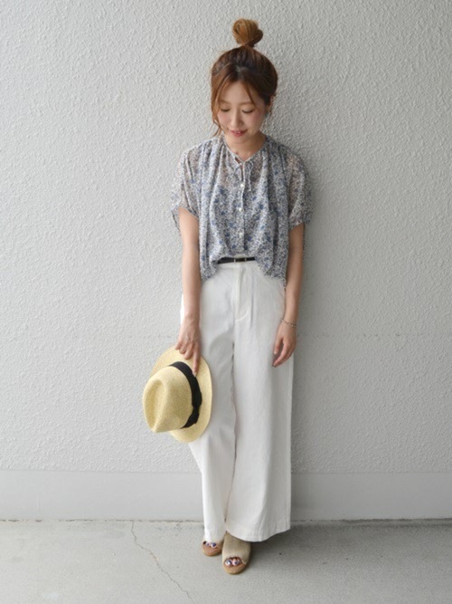 清純風的透膚上衣配上白色寬褲能立即提升時尚度!整體偏淡的色調帶有輕盈清爽的印象。