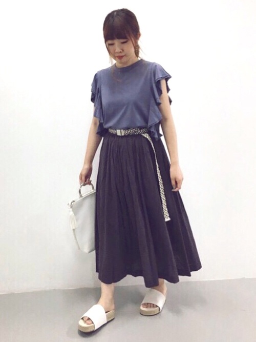 藉由上半身和下半身都使用同一色系的單品營造高雅的印象。