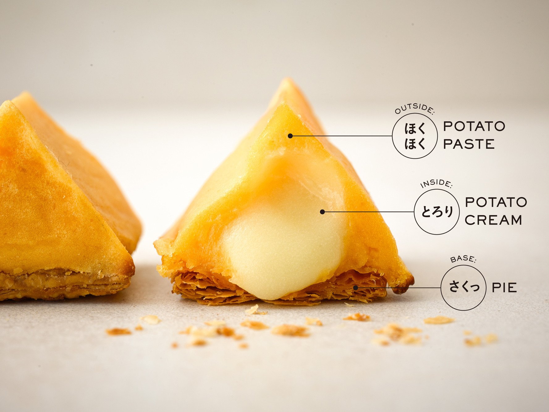 「POGG」這個品牌名稱是結合了「POTATO」與「DIG」的造語,不再只是日本人從小吃到大的甜薯點心,凝縮了創新製法與玩心打造出的甜薯派絕對大不相同,無論是外型、口感、味道都經過改良再進化,熱呼呼的現烤甜薯派馬上就出爐囉!3種口感一次滿足!三角形的甜薯派真的好厲害