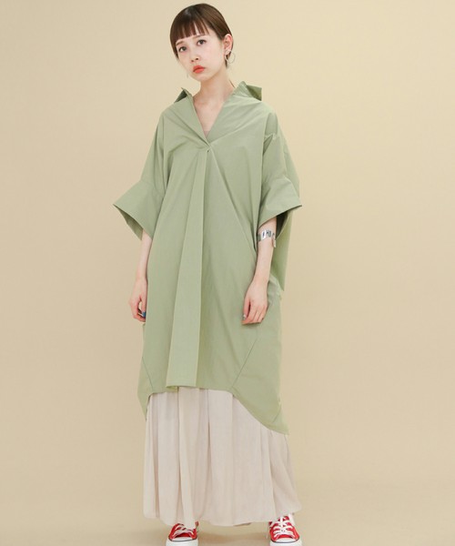 以大片剪裁的設計表現出當季風格的設計袖V領無扣連身裙,只需要簡單的穿搭就可以表現出時尚感。