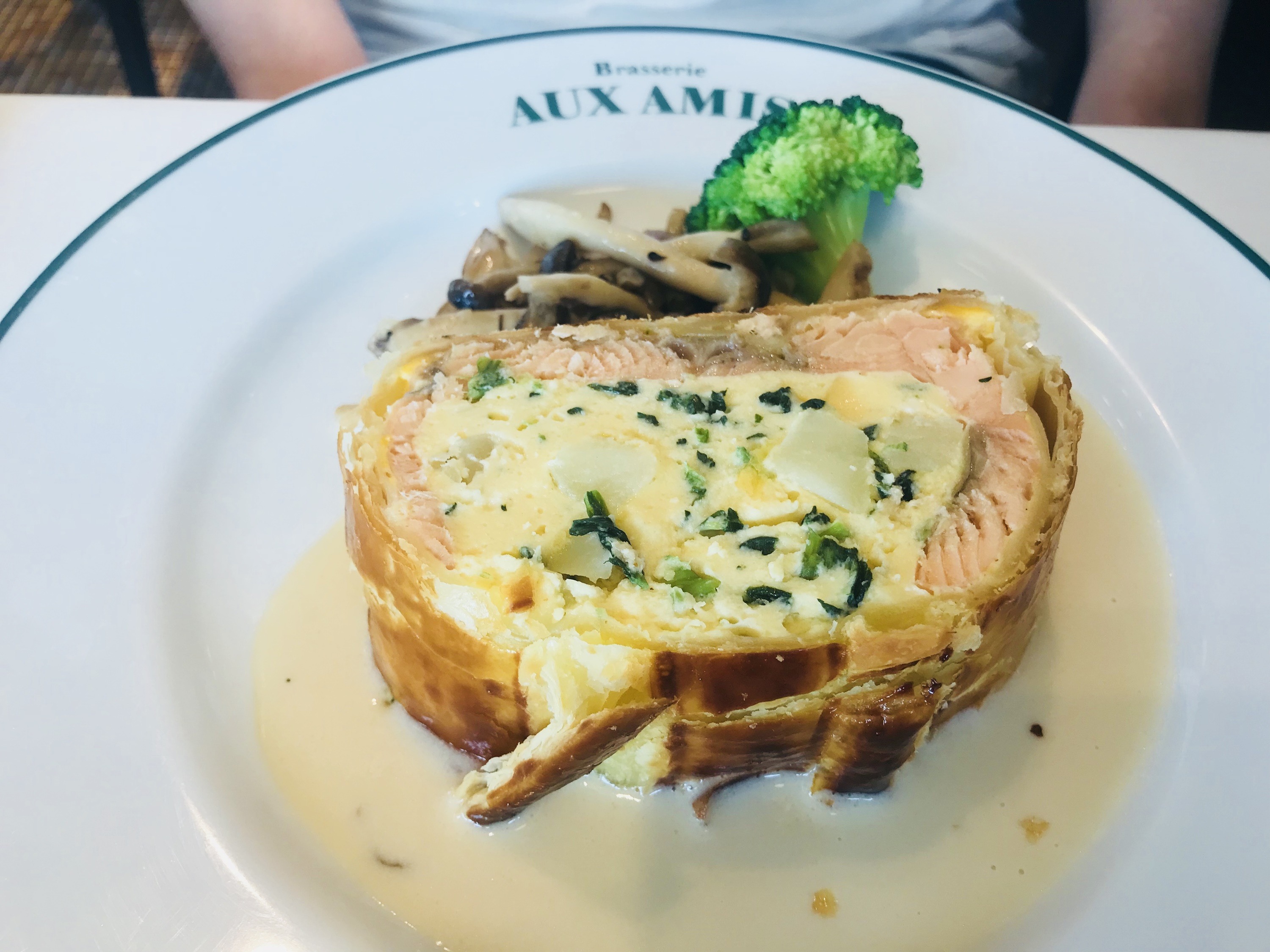 再來就是最受注目的主菜了,星期一的限定套餐是用派皮包圍起來燒烤的鮭魚排,中間還夾滿了清爽開胃的馬鈴薯沙拉,每一口都可以吃到紮實美味的食材,份量十足讓人可以吃得很飽。