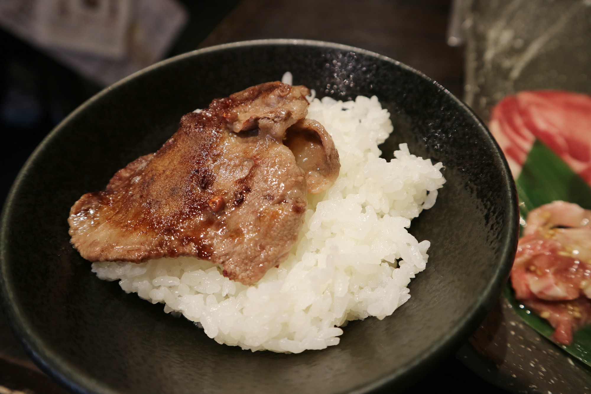 我們當天點的是蔥花鹽牛舌(1000日幣)和牛隔膜肉套餐(150g1400日幣;300g2500日幣),因為非常喜歡這兩個部位的牛肉,所以想特別集中享用。原本牛舌沾檸檬汁的吃法是最普遍的,但如果店裡有提供蔥花鹽的吃法,一定要試試看,一吃會上癮的。我的燒肉之嚴選牛舌烤過後的油脂和蔥花鹽特別麻吉,再跟白飯一起吃進嘴裡美味無窮,如果想要吃重口味一點的話可以試試看他們附上的辣味醬。除了十片肉質鮮嫩的牛舌外,還附一些牛舌其它的部分,可以吃到不同的口感。