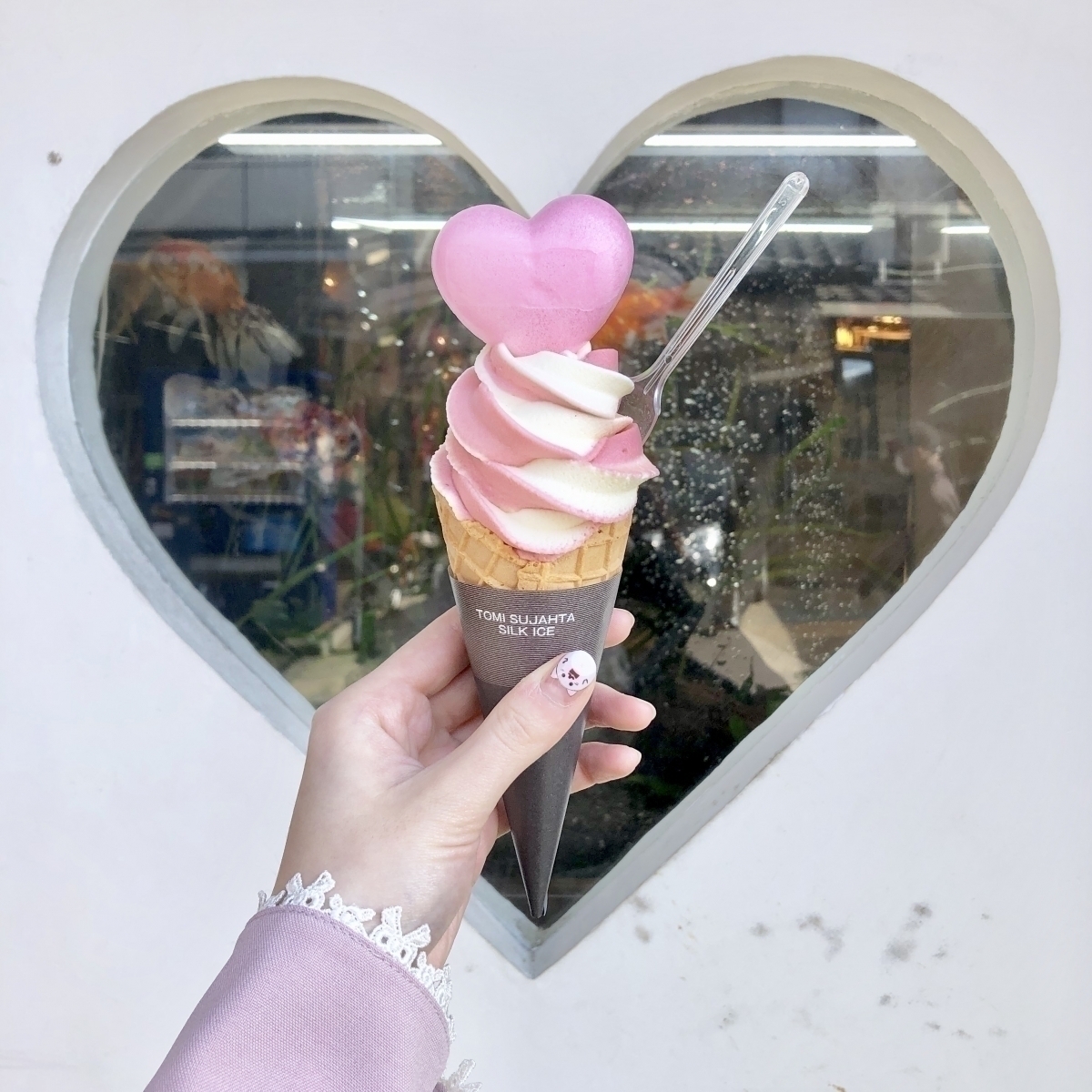 裝飾著愛心造型的霜淇淋「草莓牛奶(350日幣)」,恰到好處的草莓酸味與偏低的霜淇淋甜度,冬天也能一口接一口吃光光。 據說店家的愛心設計概念是參考自三光稻荷神社的心型繪馬呢!推薦攝影景點在這裡。
