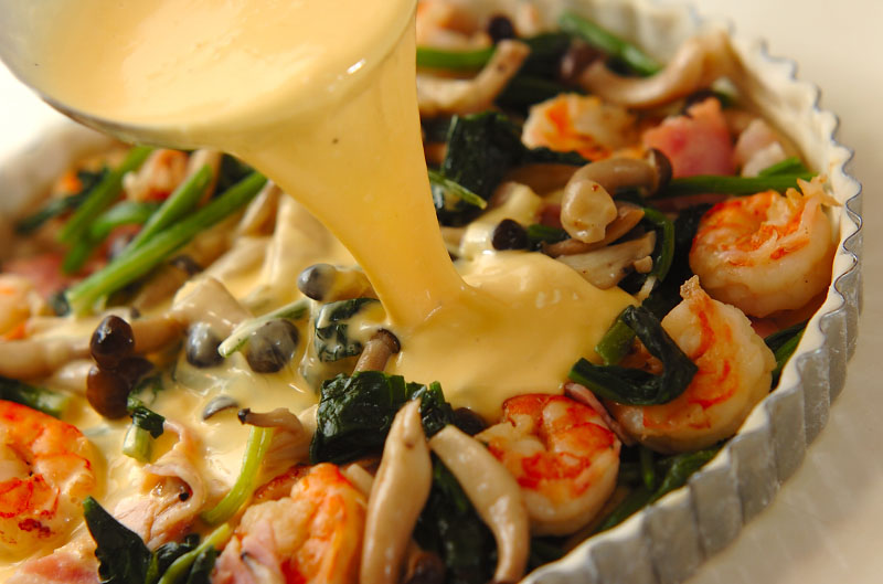 【作法】殘留在平底鍋內的奶油用中火加熱,炒蝦子。蝦子變熟後,再炒入培根、波菜、鴻喜菇。