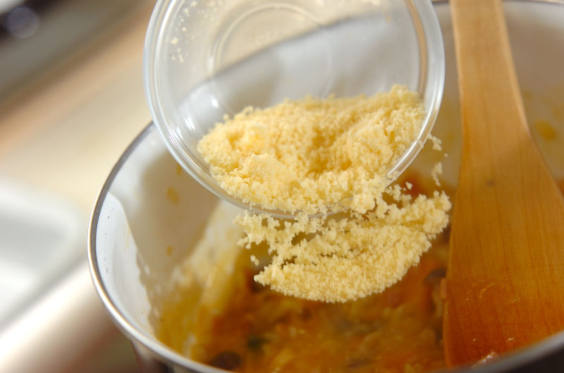 當白米變成半透明狀後倒入白酒,用大火快速翻炒將水氣蒸發掉,再來加進南瓜混炒。