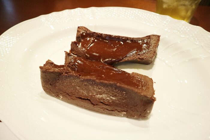 還有一個吃法是,將巧克力蛋糕放進冰箱裡冷藏後再拿出來享用,適合切成薄片狀,此時冰冰涼涼宛如生巧克力般微硬口感在嘴裡融化的速度變緩慢,又是另一種不同風味,可以享受細細品嘗的愉悅時光。