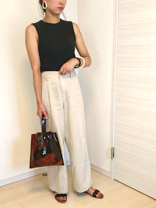 具有俐落的外型與清爽的觸感,在炎夏穿起來也輕鬆舒適的 UNIQLO 亞麻混紡寬版褲。統一為黑白色調的造型,看起來也不會顯得沉重呢!
