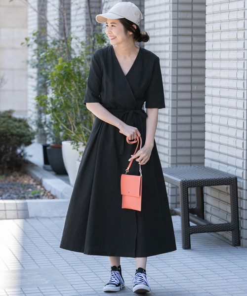 如果想穿出成熟風味,首推的就是交叉領連身裙。搭配棒球帽及運動鞋增添休閒感,就會有一股信手拈來的隨性風格喔。這件交叉領連身裙也可以將正面打開變成長袍式外搭,十分優秀。