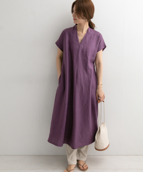 穿起來令手臂顯得很美的法式袖渡假風連身裙。使用觸感涼爽、吸水速乾、抗UV的高機能亞麻材質製成。是一款既好穿又線條美麗,兩種優點兼具的逸品。