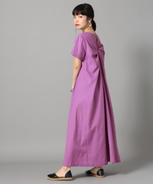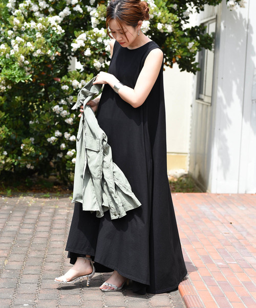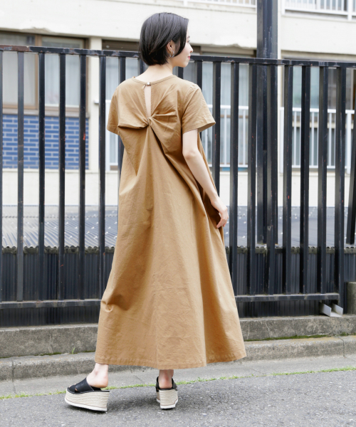 只要穿上黑色連身裙,不用任何技巧就可以達到時尚效果。由於背後領口是綁帶設計,顯露出一股不經意的時尚感呢。只要搭配天然材質的配件單品,就可以打造出印象優良的休閒穿搭。