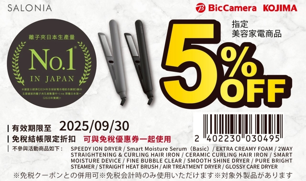 SALONIA 是日本人氣美髮造型品牌。產品不僅外型時尚、輕巧便攜,溫度控制與加熱速度也表現優異,深受消費者喜愛。購買SALONIA指定商品,除了既有免稅與Bic Camera專屬折扣外,出示以下優惠券還外加5%折扣喔!