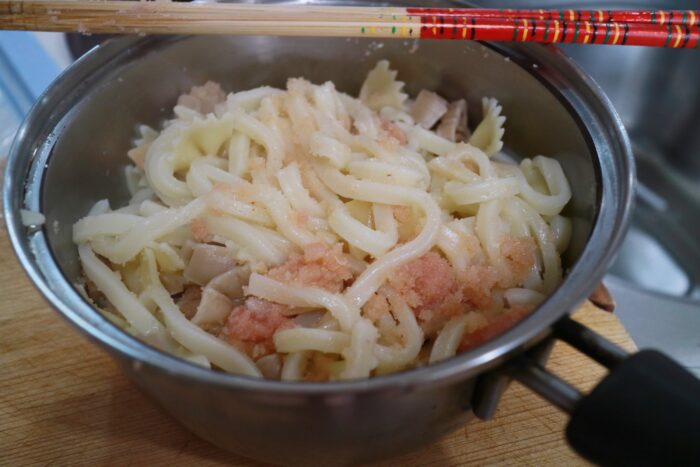 4.將烏龍麵煮熟後拌入明太子,記得留一些明太子最後擺在烏龍麵的上方