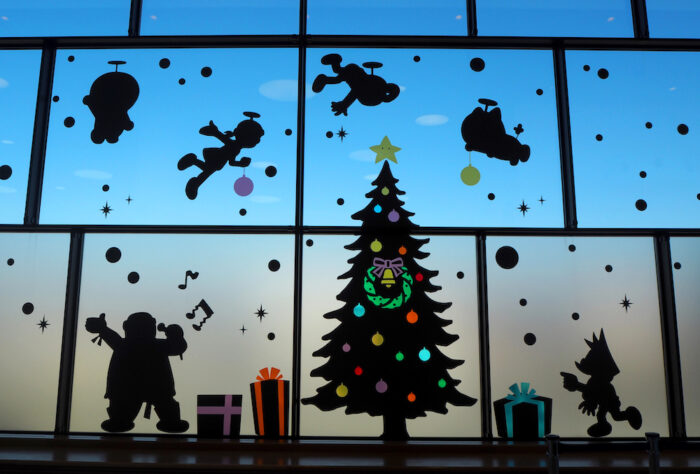 大廳的玻璃窗上,愛唱歌的胖虎、調皮的小夫、享受著聖誕節氣氛的哆啦A夢夥伴們,圍繞著聖誕樹歡樂的嬉鬧著,不只如此,走入館內,每個角落都有聖誕節裝飾的小驚喜在等著你喔!