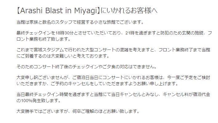 嵐在利府的演唱會?聽說去參加的人紛紛搶訂鳴子溫泉常入住的旅館。但是一聽到演唱會結束後已經沒有電車可以到達旅館,便一個個取消預訂。如果有聯繫上就好,但是也有人連旅館打來的確認電話也不回電,因此有些苦惱。