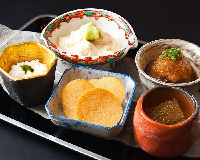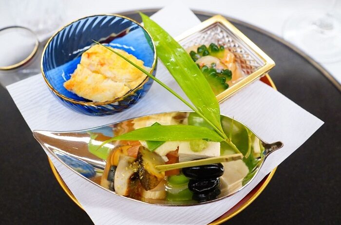 八寸小菜包含必嚐的瓢亭玉子、鯛魚和鱧魚押寿司、醬煮小魚乾、岩梨等,瓢亭玉子蛋白滑嫩、蛋黃濕潤,調理得恰到好處。