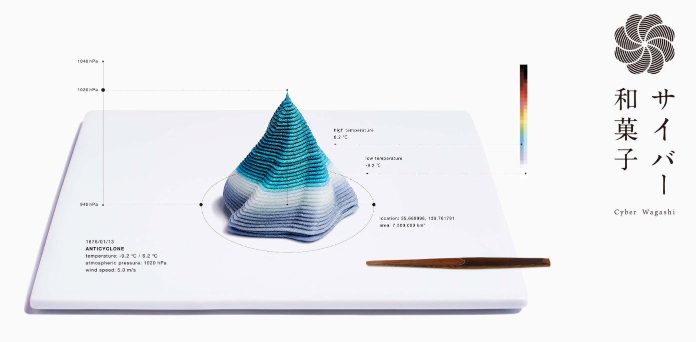 「CYBER WAGASHI」運用獨特的演算法、以氣象資料為基底進行開發,最終透過3D列印將這些構想化為可食用的和菓子。因氣候變遷與都市化加速的影響,在已無法深刻感受到四季流動的現在,希望讓大家可以透過享用因風速、氣壓、氣溫的差異而表現成不同形狀、顏色的和菓子,再配上當下東京的「天空」來探觸四季的奧秘。