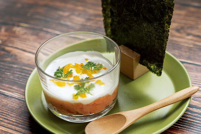 搭配的優格醬汁中嘗得出高湯的鮮美,再用海苔包著濃郁的白味噌鮭魚一起入口,既清爽又迷人的滋味想必會讓你相當難忘。