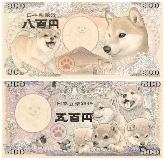 如此可愛的豆柴搖身一變成取代日幣上的人物,躺著萌、坐著萌,怎麼樣都可愛的豆柴紙幣完全燃起狗派的收集慾,尤其是那500元日幣上五隻呆萌的豆柴,不只豆柴的萌描繪的栩栩如生,背景部分也細緻描繪出日本特有鳥類和植物。