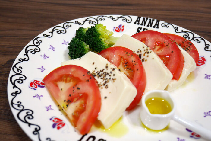 ③ 將浸泡好的豆腐與蕃茄交疊擺盤,淋上橄欖油,撒上黑胡椒顆粒,放上綠花椰配色即可。