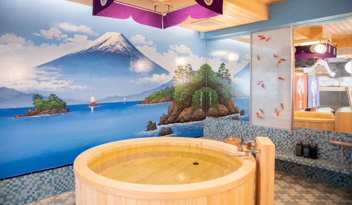 在這新鮮卻又兼顧舒適的嶄新空間中,一邊是錢湯風格的浴室, 裡面設置了一個檜木浴槽讓大家能和家人或是朋友一起泡澡,牆上的錢湯繪也請來了專門的湯繪師親自操刀,更衣處不管是冰箱、鏡子都做得如同是真的錢湯一般,真的好有趣哦!
