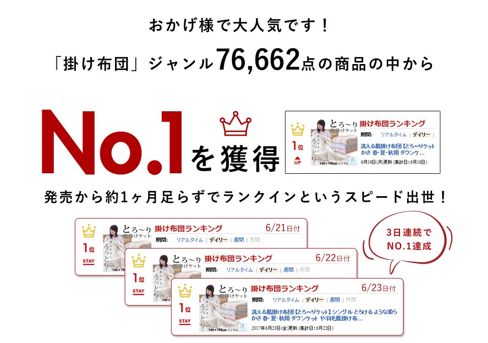 江崎薄被於六月正式上市,不到一個月時間立刻空降樂天市場銷售排行榜冠軍,在七萬多件棉被品項中取得佳績,後續更因口碑爆棚,店家屢屢補貨也是被一掃而空。