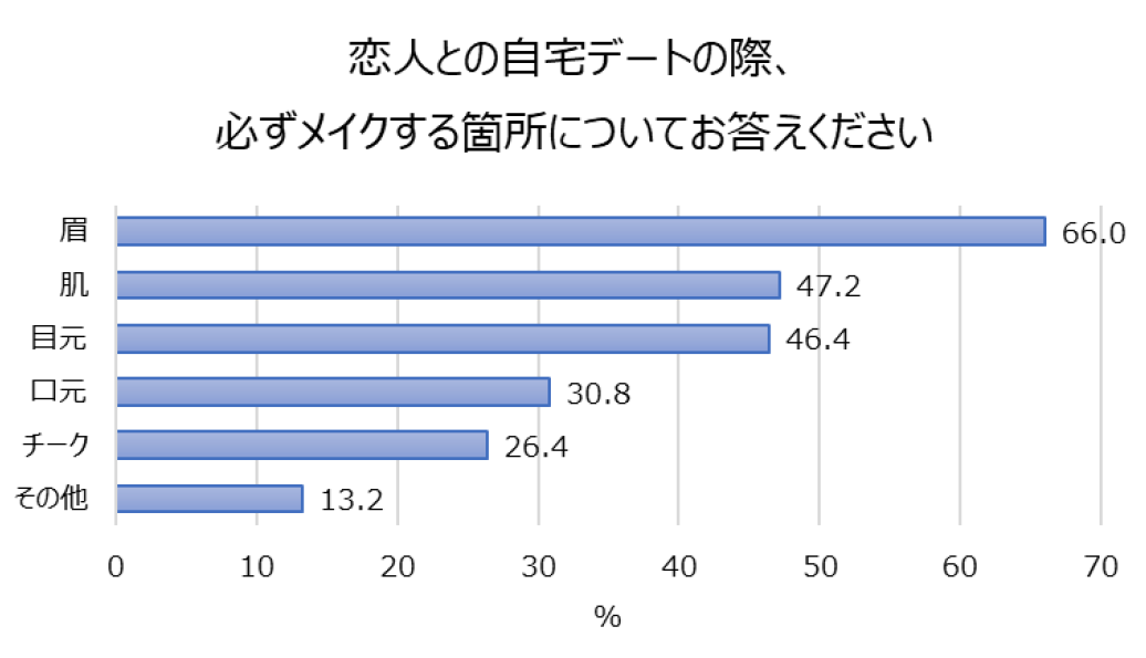 該問卷也針對疫情之於交往關係的影響進行一番調查,有將近6成的受訪者表示和男女朋友的相處方式有所改變,如在外約會的頻率降低,反之透過電話和視訊聯絡、在家約會的頻率則較過往大幅提升。而針對在家約會時一定會進行化妝的部位,「眉毛(66.0%)」則又不負眾望的拔得頭籌,看來會大大左右整體臉部所帶給人印象的「眉毛」,真的是化妝時的一大重點。