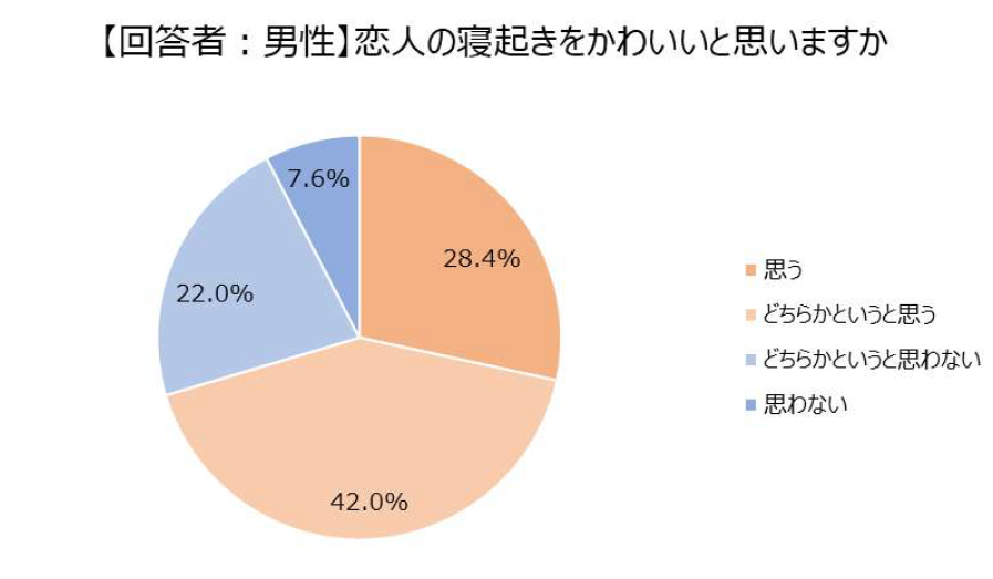 不過本次調查也針對「是否覺得女友剛睡醒的模樣很可愛」的問題進行訪問,發現其實有高達7成的男性在這一題給予了正面的回應,僅有7.6%的受訪者覺得稱不上可愛。對照前面提到的其實有超過4成的男性有感受到女友上妝前後的落差的數值來說,可以推得其實男性大多覺得無關化妝與否,其實「女友的素顏就是可愛」的結論,更有不少男性表示因為能看到戀人和平常不一樣的一面而感到開心。