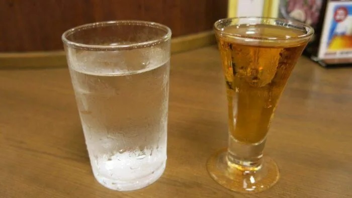 烈酒當然要配水喝,筆者當天體虛沒有點生啤酒配電氣白蘭的配法有些可惜。 電氣白蘭因為是烈酒,一定會陪著一杯冰開水,這樣純配清水與烈酒的喝法叫做 straight,這似乎是相當老派的喝法。筆者取材默默觀察著好幾組客人,大概只有單獨前來這裡,拖著孤單背影的歐吉桑會這樣點,一杯電氣白蘭配著一杯開水,一道下酒菜,默默地一口一口喝掉他。 而店面最受歡迎的喝法,也是酒吧強烈主打的喝法,則是點一杯電氣白蘭配著冰涼的生啤酒,兩種酒品交錯著喝,這樣的喝法在熱鬧的大桌上跟(有點年紀的)上班族酒聚中可以看到,當年摩登紅極一時的明治景色,他的餘韻過了一百年似乎還能夠在這家店面中體會到。 另外一種是在網路上流傳的特別喝法,是一杯咖啡杯大小左右的紅茶倒進電氣白蘭裡,因為電氣白蘭特殊的香氣跟白蘭地跟紅茶很搭,各位酒鬼們敬請買回家嘗試看看囉。