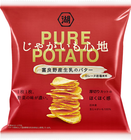 在馬鈴薯中找出「PURE POTATO」最適合使用的品種,奢侈的厚切後,加入富良野生產的生乳奶油,炸出風味絕佳的洋芋片,在100%馬鈴薯的原始滋味中邊咀嚼邊散發生乳奶油的濃醇香味,讓人一口接著一口停不下來。