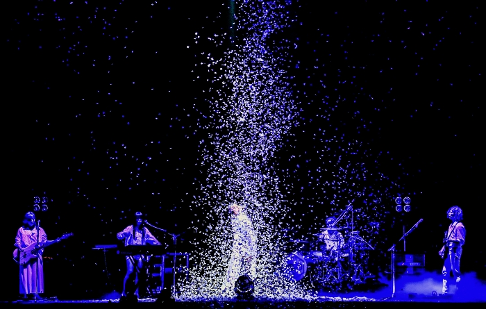 舞台沒有過多裝飾,畢竟團員們本身就夠華麗了。在主視覺藍色的燈光照耀下,貝斯手YASHI·-chan、鼓手RURI-chan、吉他手HIBARI-kun以及支援鍵盤手MII-chan,4位團員擺好POSE由舞台中央的升降舞台華麗登場。4個人就定位開始演奏第一首歌〈HBD〉前奏時,主唱AVU-chan才緩緩登場,為首日表演揭開序幕。
