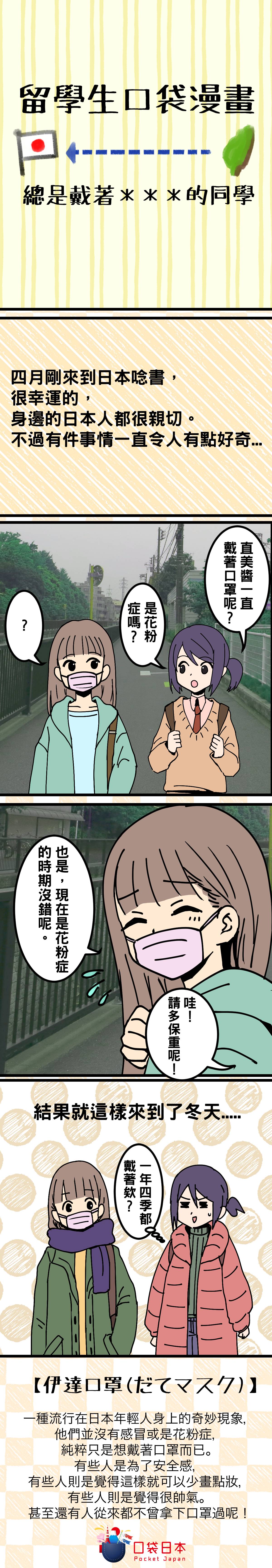 從十年前日本就有許多日本學者觀察到在年輕族群出現了與生病、過敏無關的「口罩年輕人」,這樣的現象被稱之「伊達口罩」,而伊達口罩的成因很複雜,但大多認為是與年輕人認為戴上口罩之後能夠對外產生一種隔絕,進而產生了安全安心感,對於經常要面對同儕壓力的年輕人來說,戴著口罩對交際、對外界的壓力能夠些許的減輕,但卻也造成了有些年輕人甚至嚴重到無法在大家面前脫下口罩的狀況。 因為防疫,外出的我們都得戴著口罩,而面對未來疫情結束之後,會不會也會有人「脫不下口罩」了呢?認識了伊達口罩後,也許這是我們未來值得思考的問題喔!