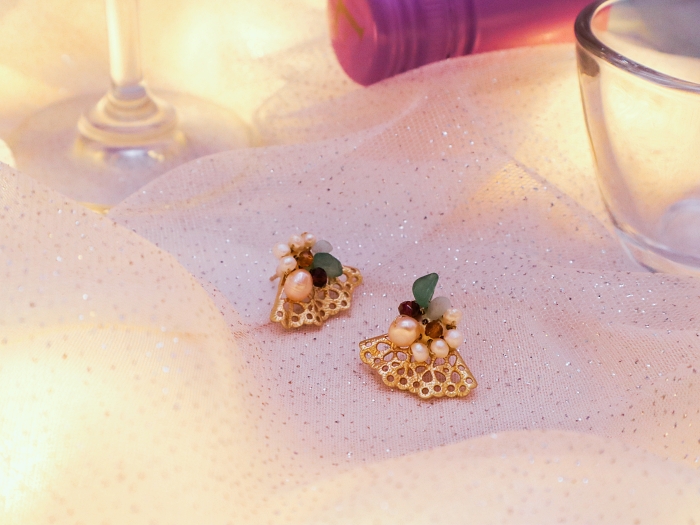 天然石與珍珠錯落有致地綴在蕾絲花邊般的金屬片上,三種截然不同的材質搭配起來竟然非常協調又充滿異國風情,特別的設計讓人忍不住多看兩眼。更有趣的是金屬片還可以拆卸下來,可以根據當天的心情、場合搭配服裝。